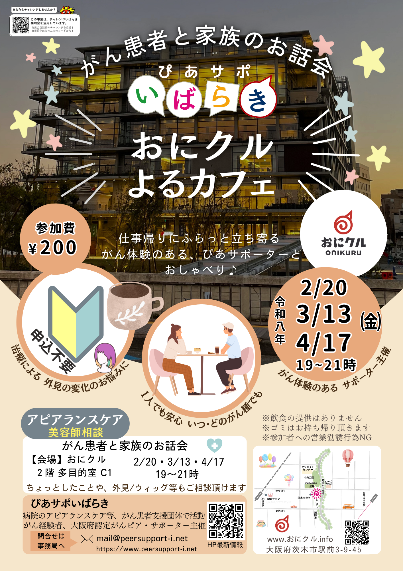 がん治療・再発治療の経験者・当事者・家族が先生や看護師さんには話せないことも がんに向き合う同じ経験者に気軽にお話できる「おにクルよるカフェ」